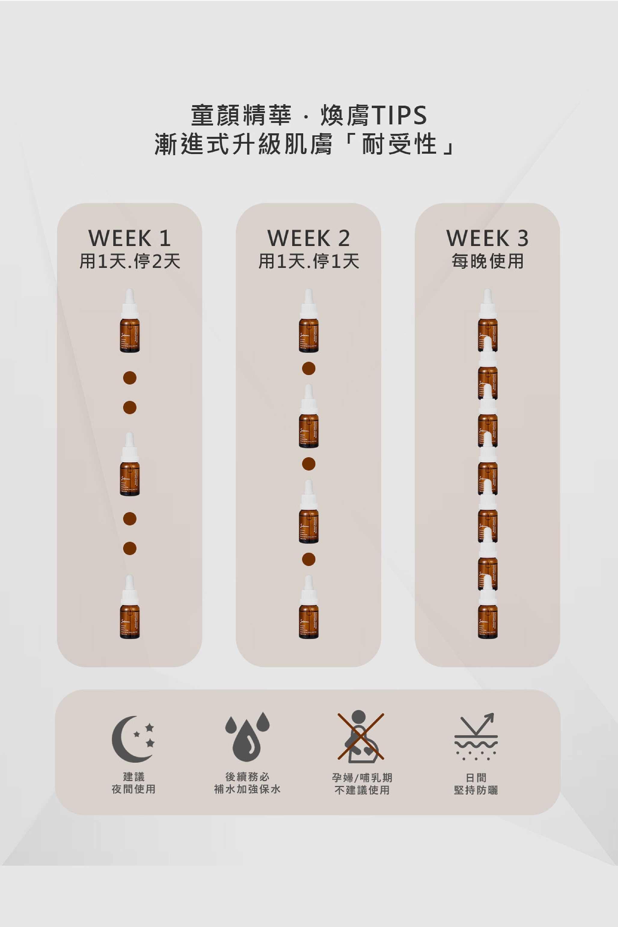 1. 此精華建議漸進式使用,於晚間使用。