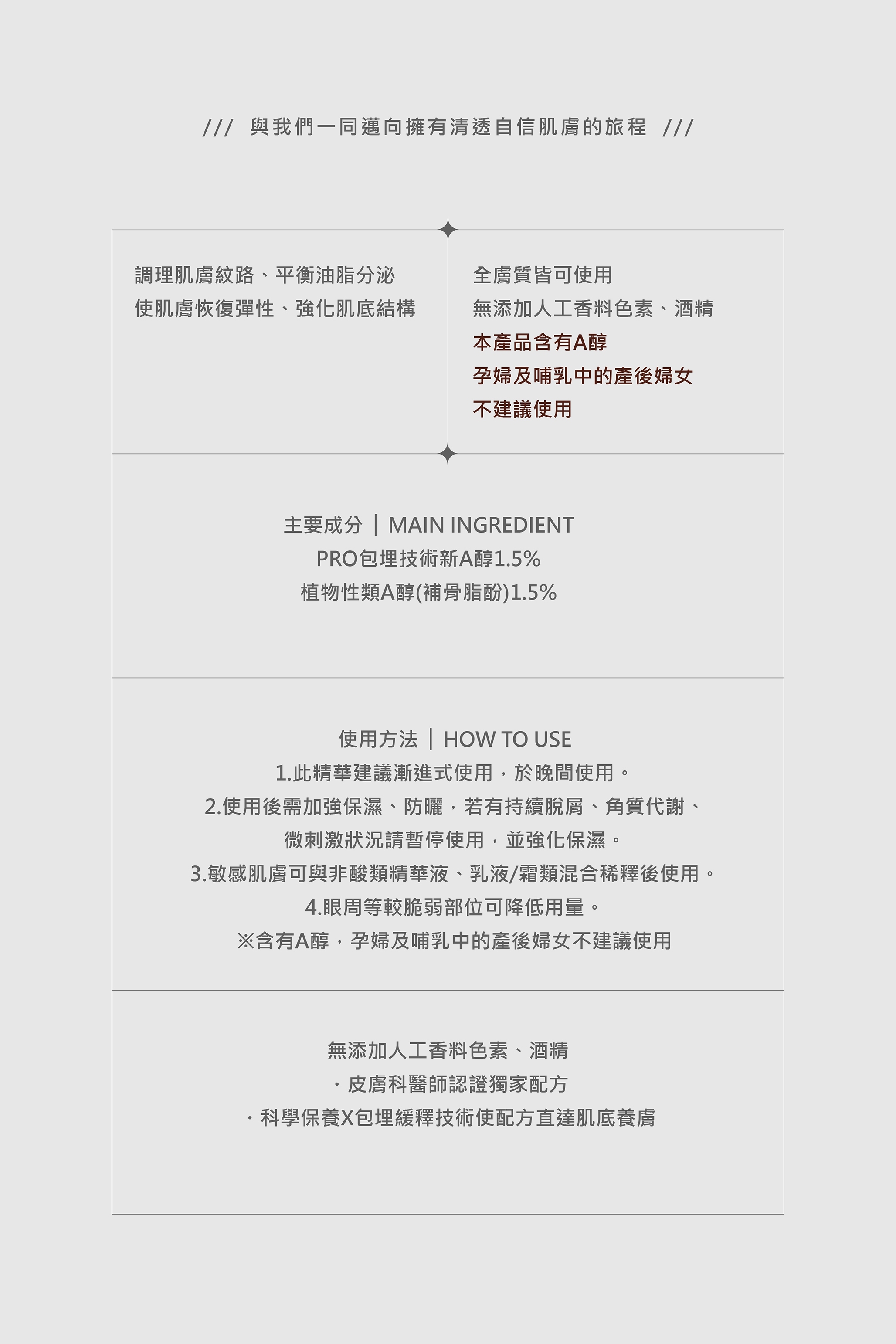 ※含有A醇,孕婦及哺乳中的產後婦女不建議使用。