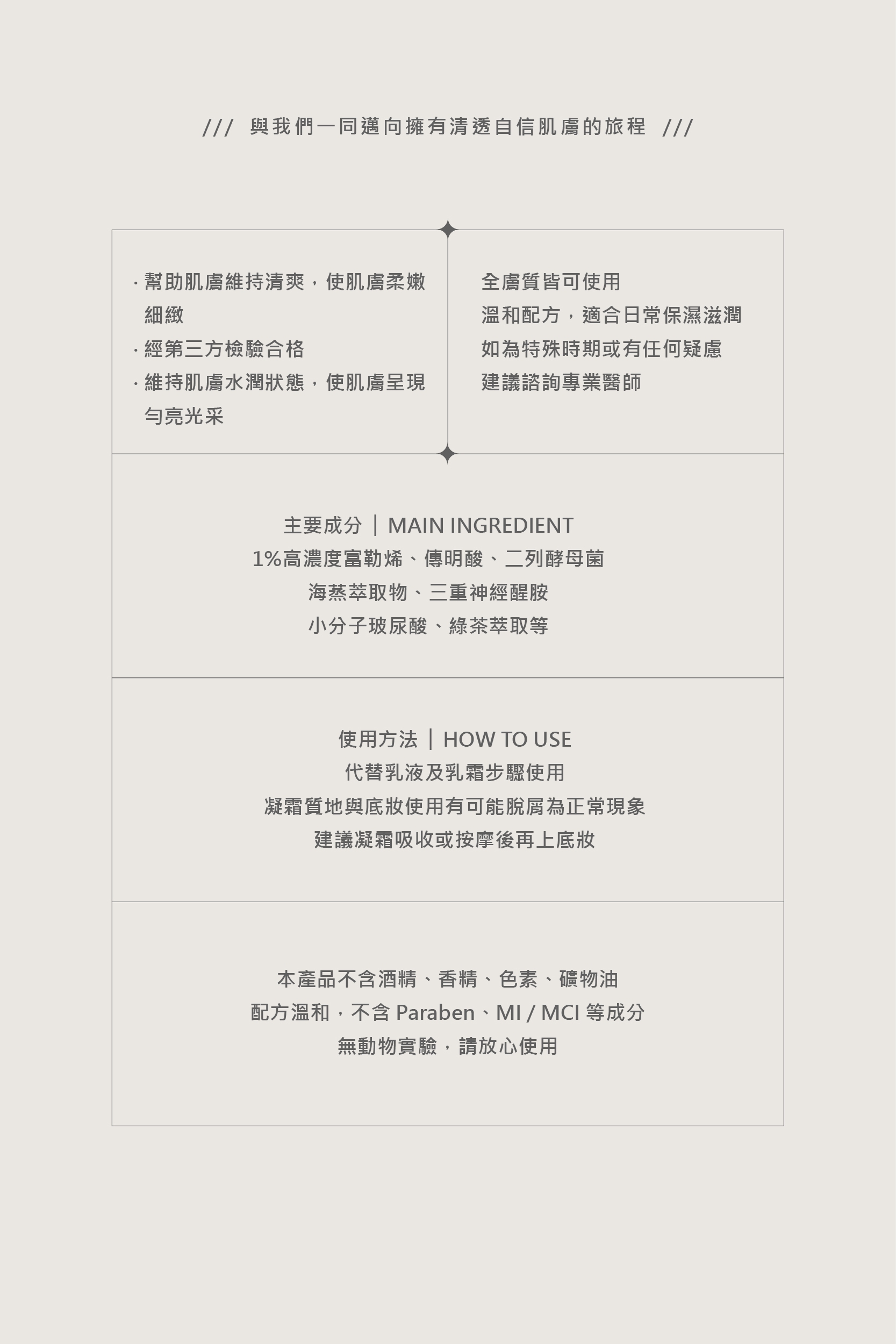 • 代替乳液及乳霜步驟使用,凝霜質地可能與底妝使用有脫屑為正常現象,建議凝霜吸收或按摩後擦拭再上妝。