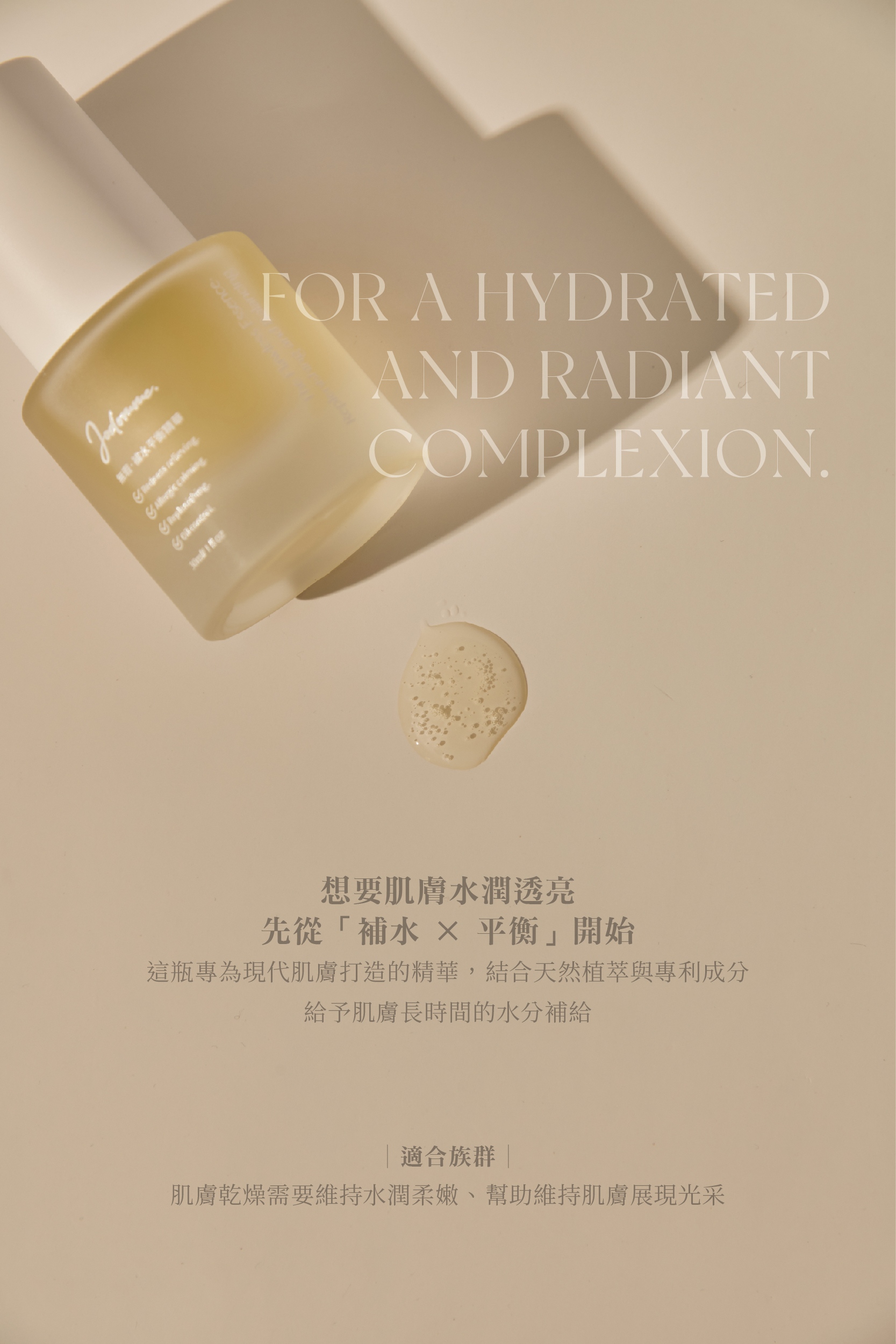 「專利純淨平衡配方+黃金科學比例,打造澎潤飽滿的水光好命肌養成必備組合」