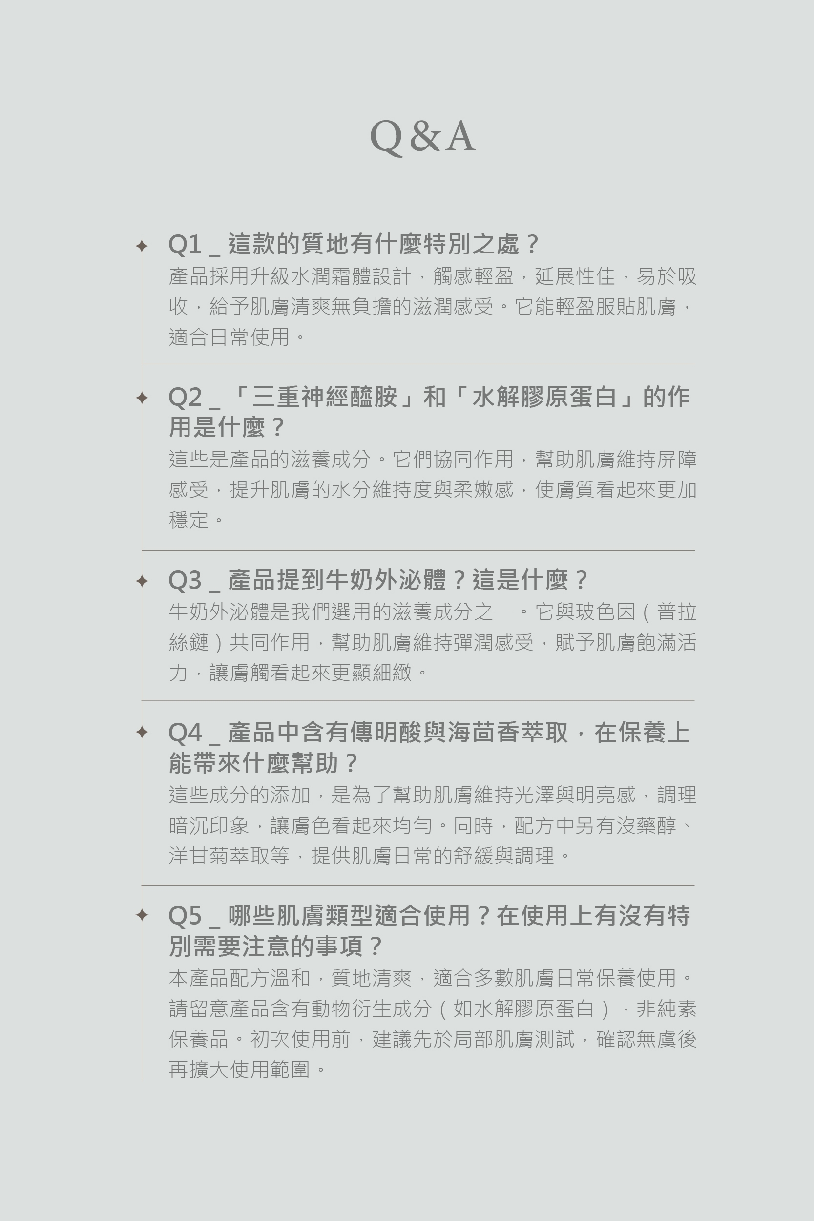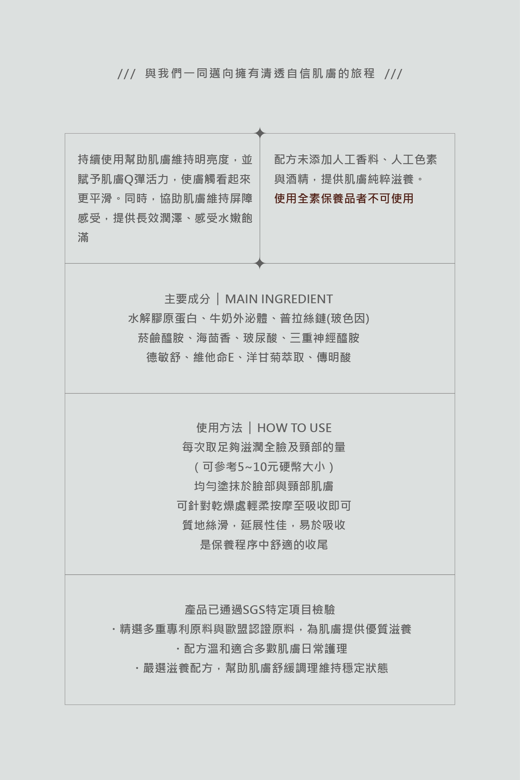 • 代替乳液及乳霜步驟使用,凝霜質地可能與底妝使用有脫屑為正常現象,建議凝霜吸收或按摩後擦拭再上妝。