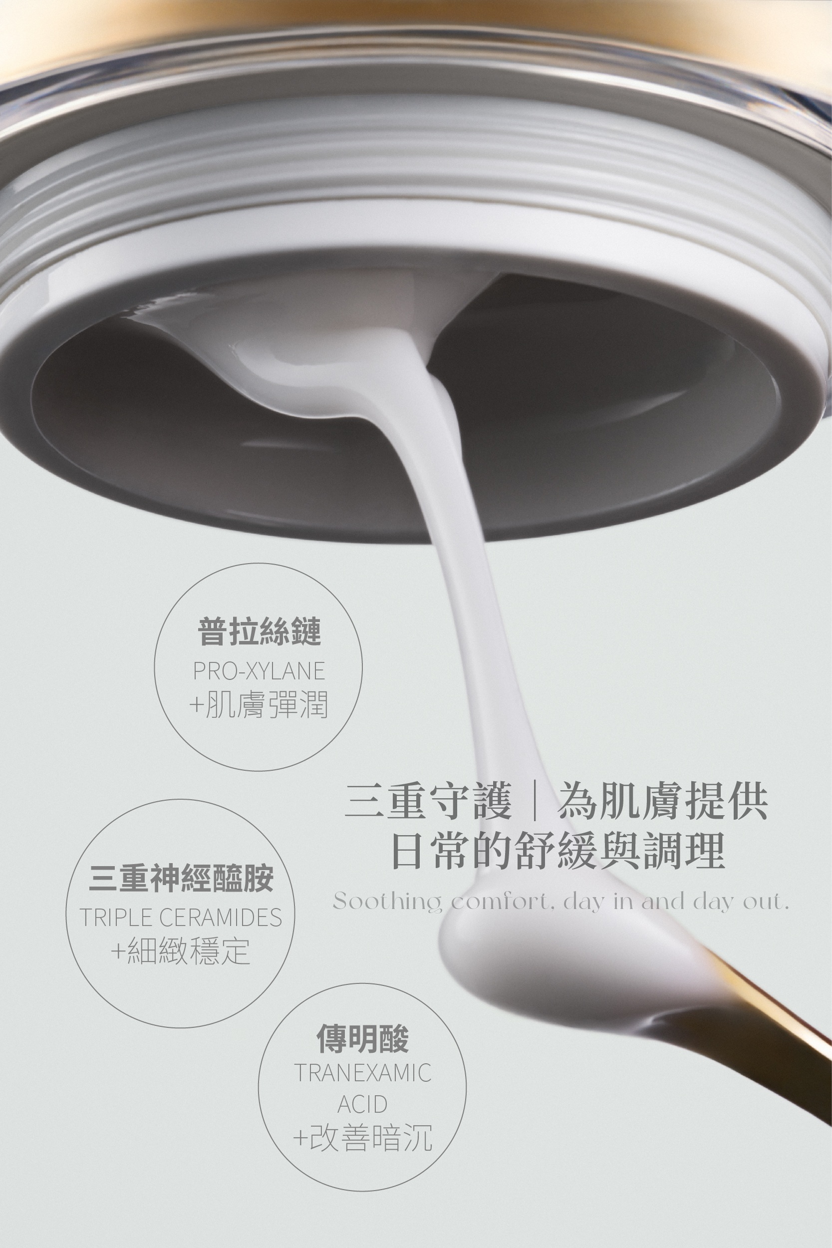 · 三重神經醯胺、小分子玻尿酸、綠茶萃取等強化肌膚保濕能力,提升肌膚對外在環境的防護、補水鎖水成分