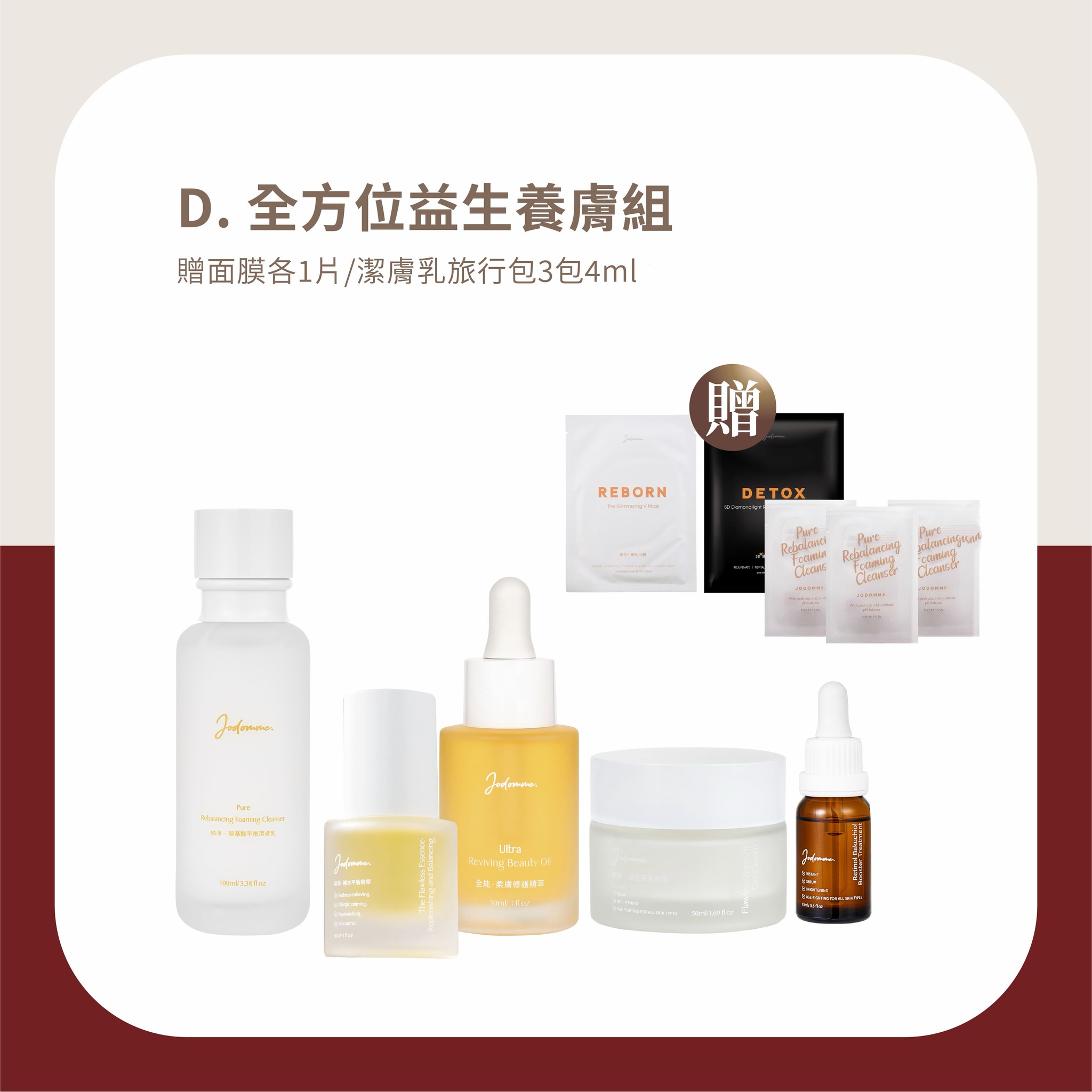 (潔膚乳3包、補水精華15ml、全能精萃10ml、益生霜10ml、喬朵化妝盥洗包)